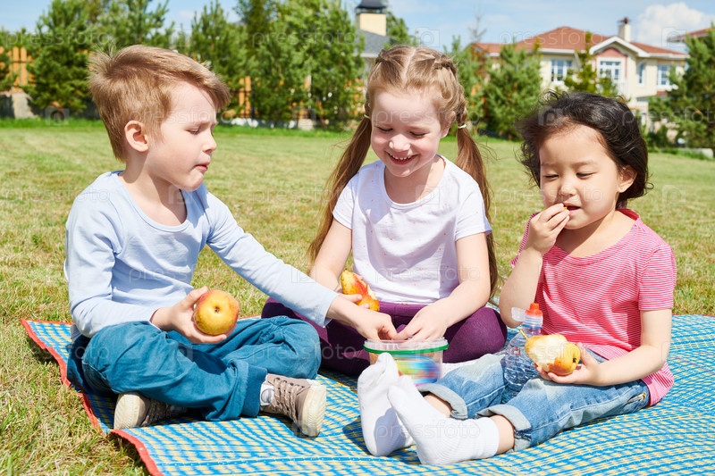 Дети наслаждаются пикником на газоне