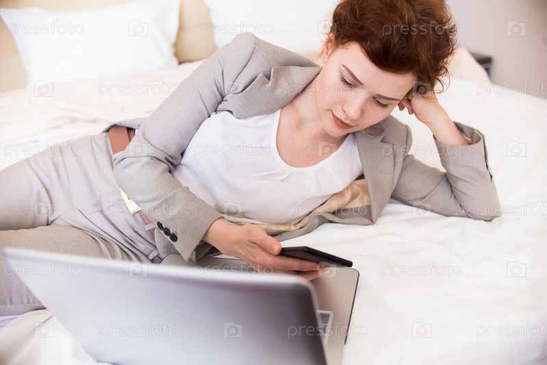 Молодая бизнесвумен с ноутбуком на кровати