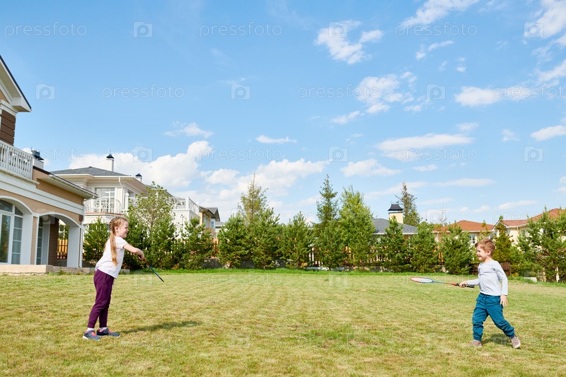 Дети играют в бадминтон на заднем дворе