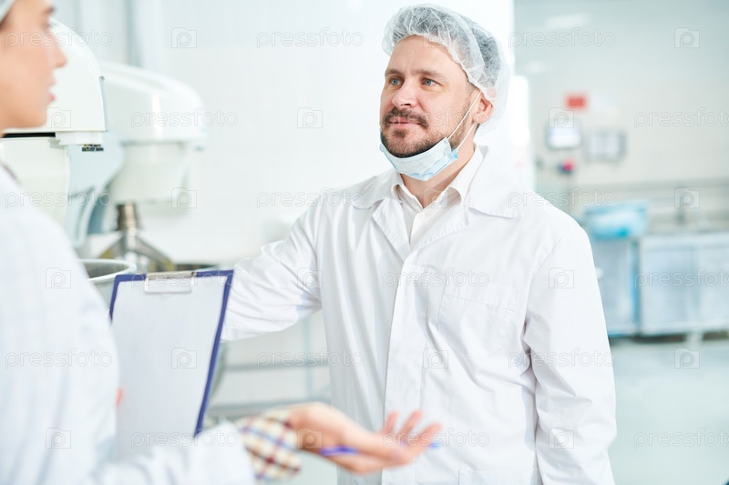 Работник фабрики кондитерских изделий разговаривает с коллегой, держащей доску