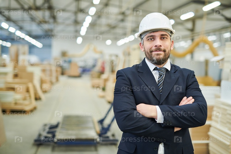 Бизнесмен в жесткой шляпе на фабрике Content