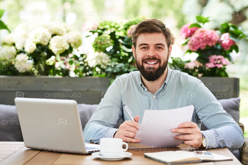 Улыбающийся предприниматель работает в кафе на открытом воздухе