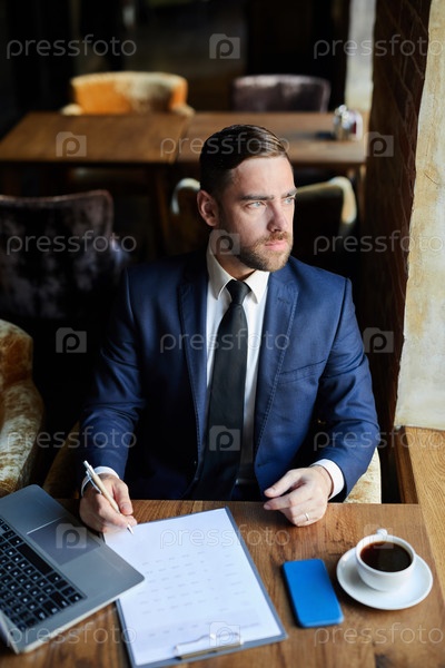 Вдумчивый человек в бизнес-кафе