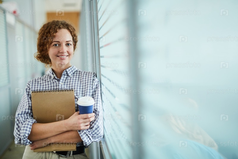 Счастливая самоуверенная студентка с кофе на вынос