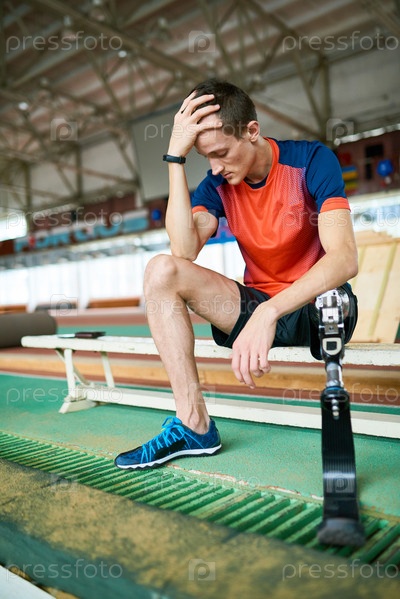 Спортсмен-инвалид сидит на скамейке в спортзале