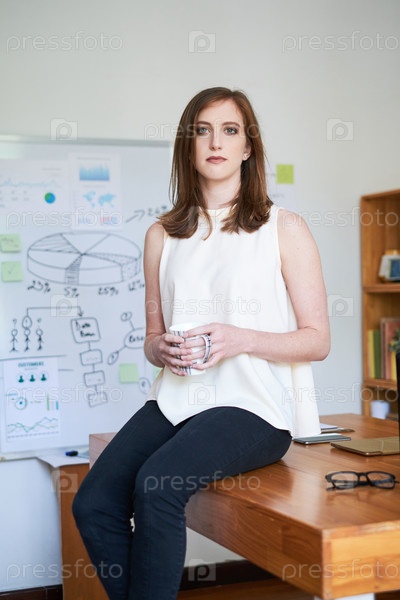 Стильная деловая женщина с кофе, сидящая за столом