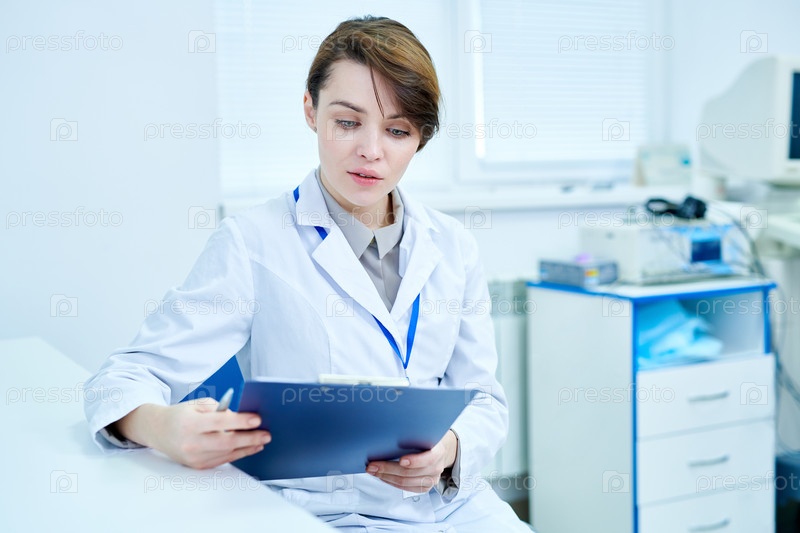 Врач сидит за столом, держит в руках клипборд и читает