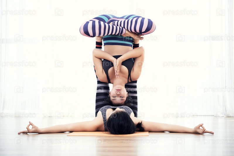 Красивые азиатские женщины практикуют акройогу в позе летучей мыши