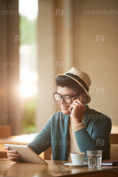 Веселый мужчина с гаджетами в кафе
