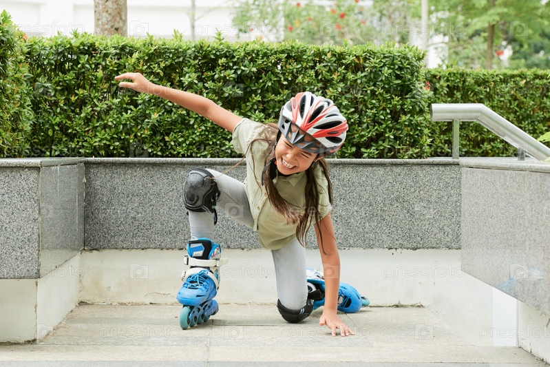 Девушка в роликовых коньках падает на землю