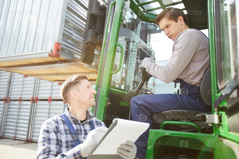 Грузовой бригадир разговаривает с молодым водителем вилочного погрузчика