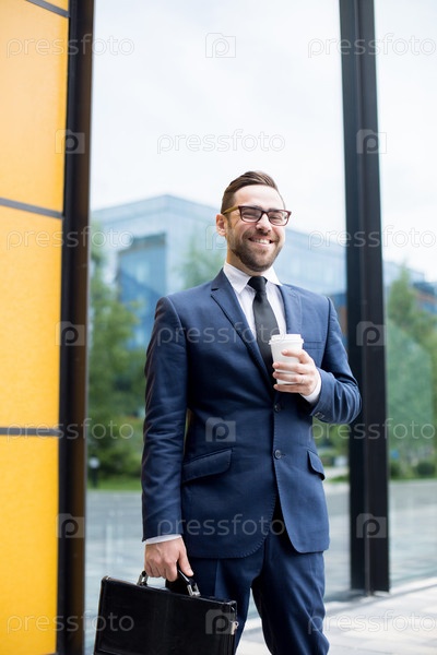 Красивый улыбающийся мужчина держит чашку горячего напитка