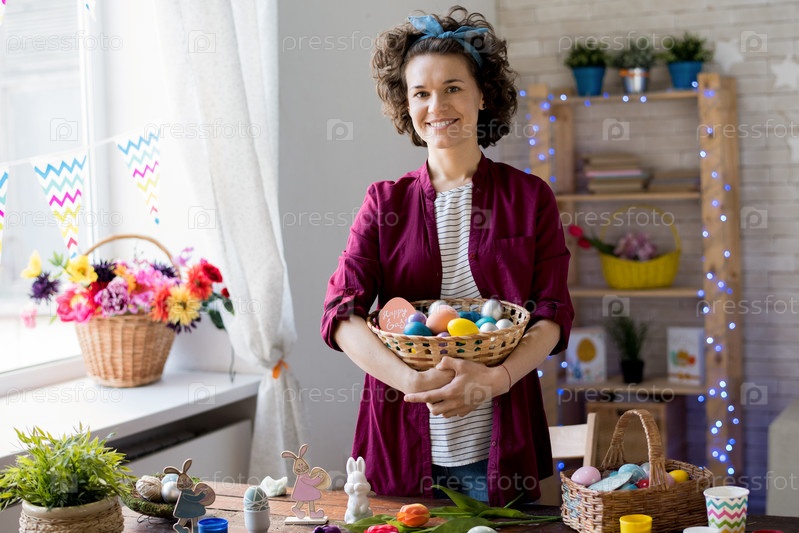 Молодая женщина позирует с пасхальными яйцами