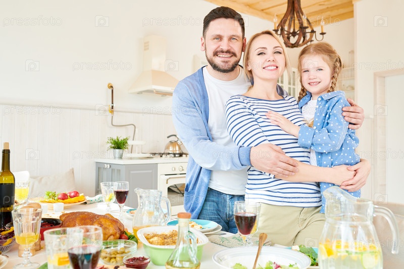 Успешная молодая семья позирует за обеденным столом