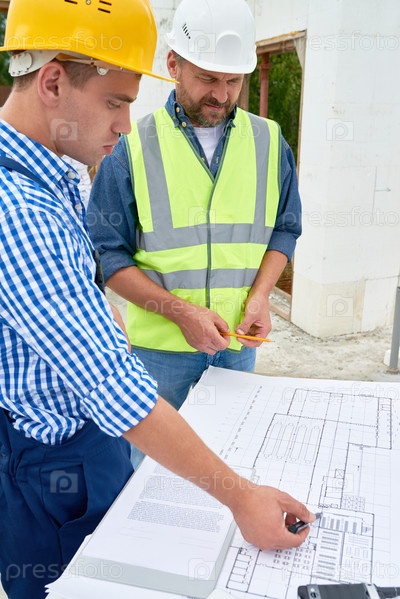 Строители проверяют чертежи этажей на строительной площадке
