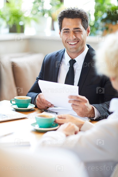 Веселый адвокат разговаривает с клиентом в кафе