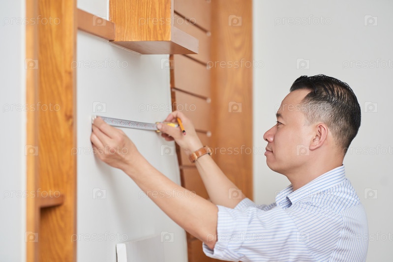 Плотник измеряет стену