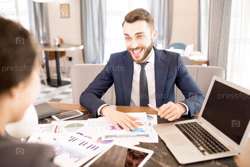 Взволнованный бизнес-аналитик работает с коллегой в кафе