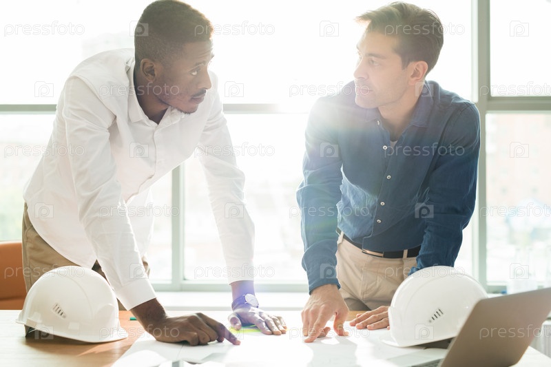 Африканский инженер-строитель объясняет строительный проект коллегам