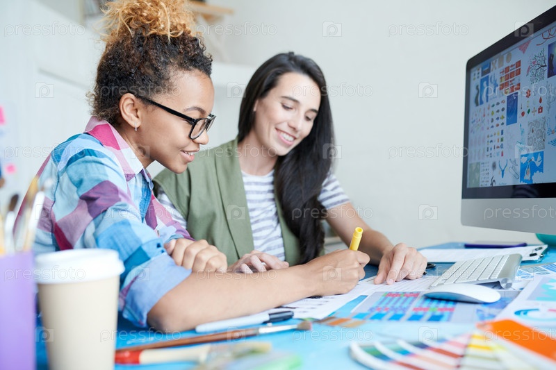 Две креативные молодые женщины работают в офисе