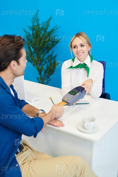 Улыбающаяся менеджерка дает терминал клиенту для оплаты
