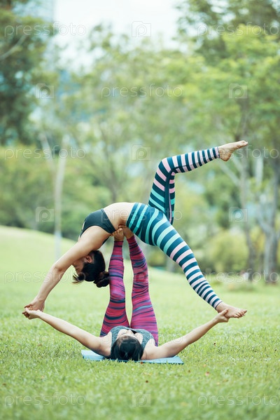 Fit Asian Acroyogis практикуется на парковой траве