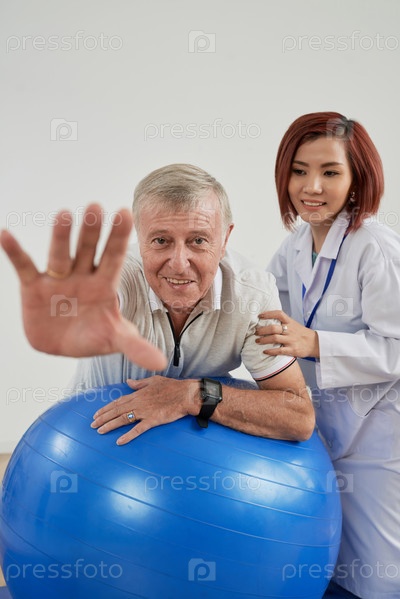 Пожилой мужчина тренируется на фитболе