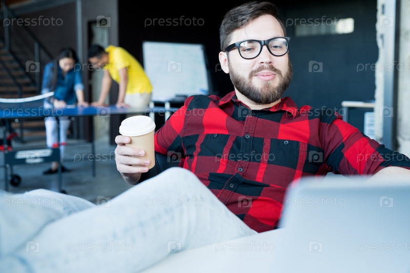 Современный бородатый мужчина охлаждается в офисе