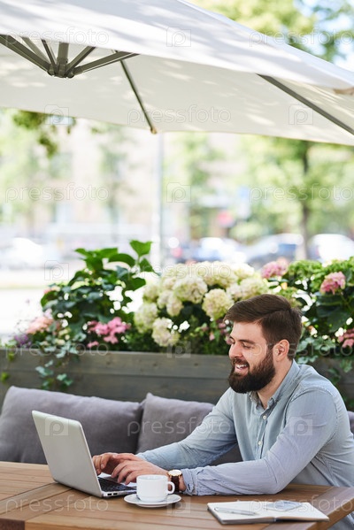 Улыбающийся бородатый бизнесмен Работает в открытом кафе