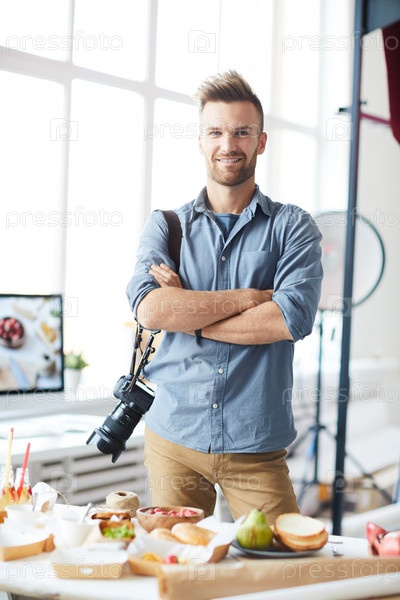 Красивый фотограф позирует