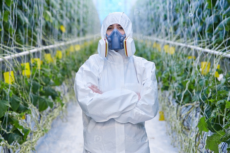 Работник плантации в защитном костюме