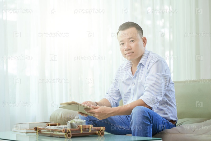 Мужчина, использующий сенсорный планшет дома