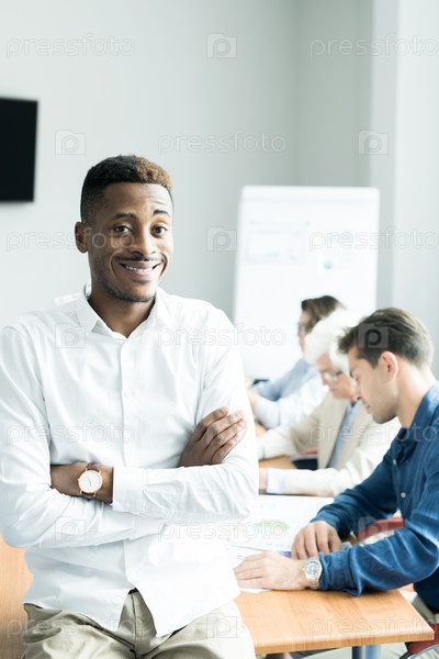 Улыбающийся африканский бизнес-тренер обучает студентов курсу