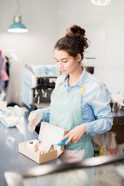 Женщина, упаковывающая торты в кафе