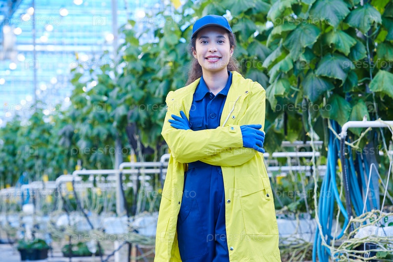 Веселая женщина позирует в теплице