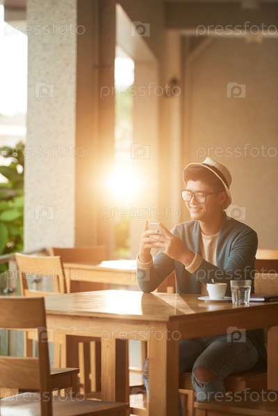 Веселый мужчина, отправляющий сообщения в кафе