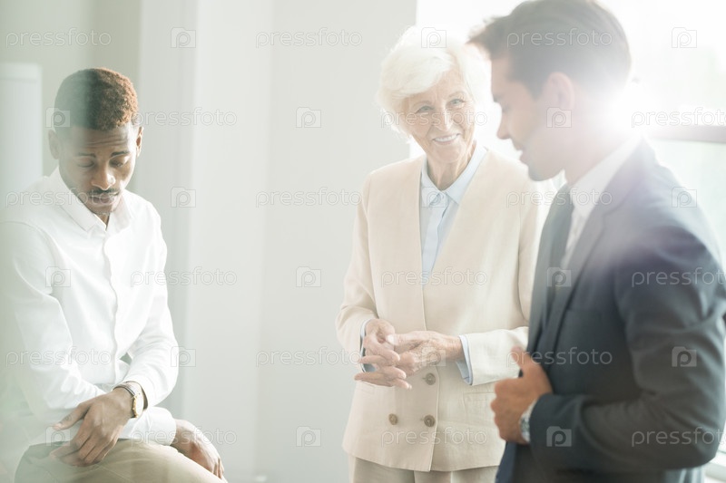 Позитивные бизнес-менеджеры обсуждают планы на брифинге