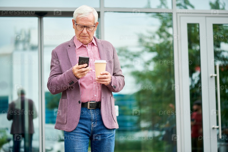 Современный старший мужчина отправляет текстовые сообщения на открытом воздухе