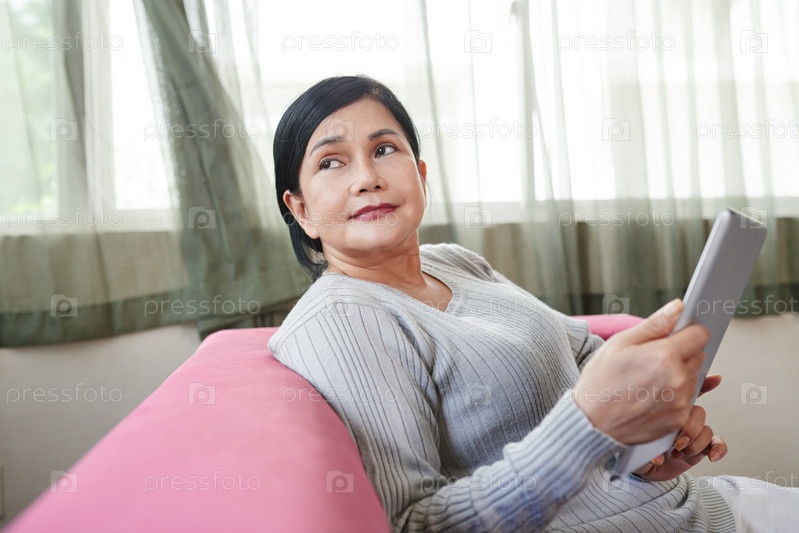 Женщина отдыхает с цифровым планшетом