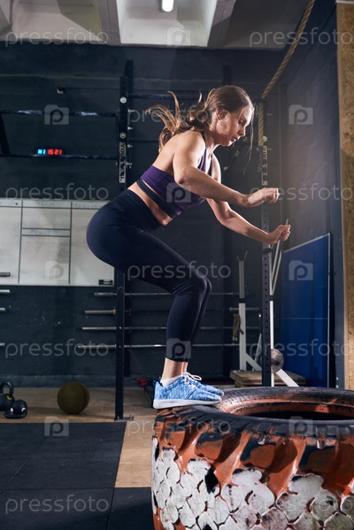 Женщина прыгает на шине в CrossFit Gym