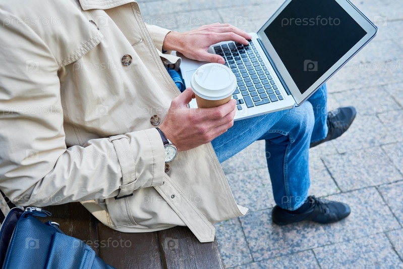 Непризнанный мужчина использует ноутбук в парке
