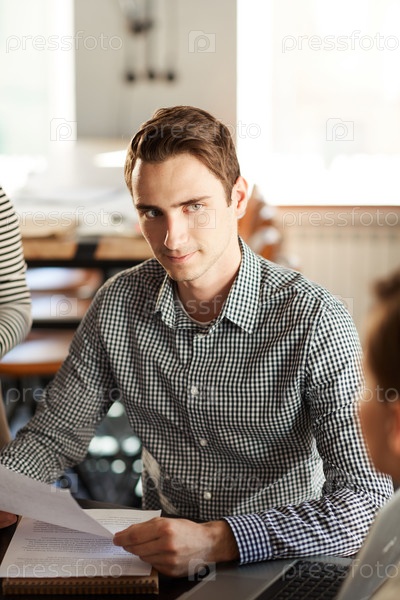 Красивый мужчина, слушающий коллег