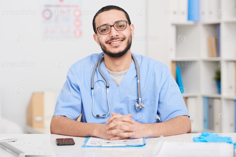 Веселый врач с Ближнего Востока позирует за столом