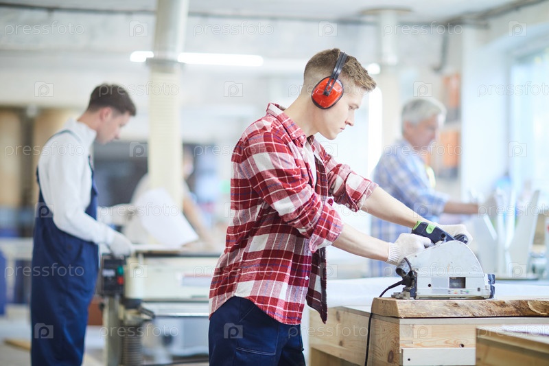 Концентрированный плотник в защитниках для ушей, работающих с круговой пилой