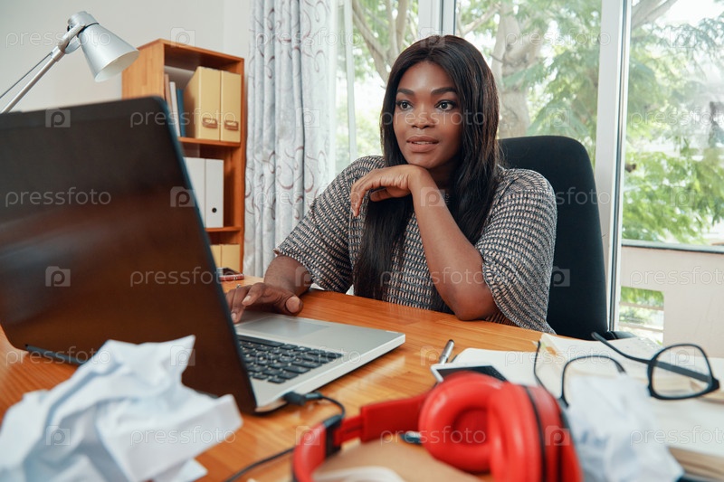 Уверенная в себе чернокожая бизнесвумен, работающая на ноутбуке