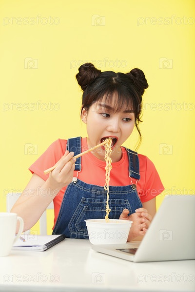 Расслабляющаяся этническая женщина ест лапшу и смотрит на ноутбук
