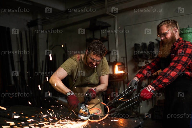 Работники режут нагретый извилистый металлический стержень