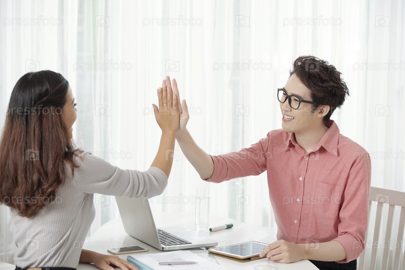 Веселые молодые бизнесмены дают высокую пятерку