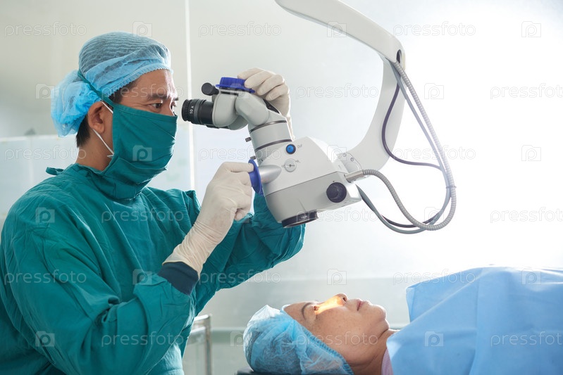Хирург исследует глаза пациента с помощью специального оборудования