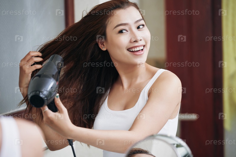 Счастливая этническая женщина сушит волосы в ванной